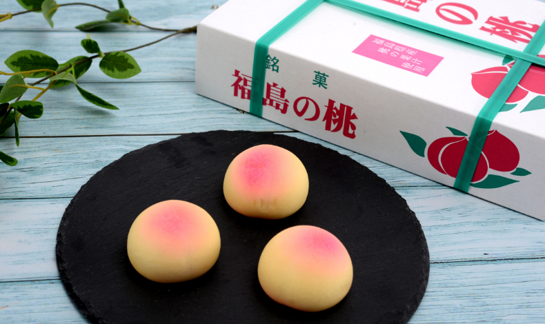 一款水蜜桃造型的日式饅頭點心,外層是淡淡粉紅色的外皮,裡面包著帶有淡淡水蜜桃風味的白豆沙,中心還夾有水蜜桃果醬,使用福島縣產的水蜜桃果汁製作,整體風味就像在吃真正的水蜜桃一樣!