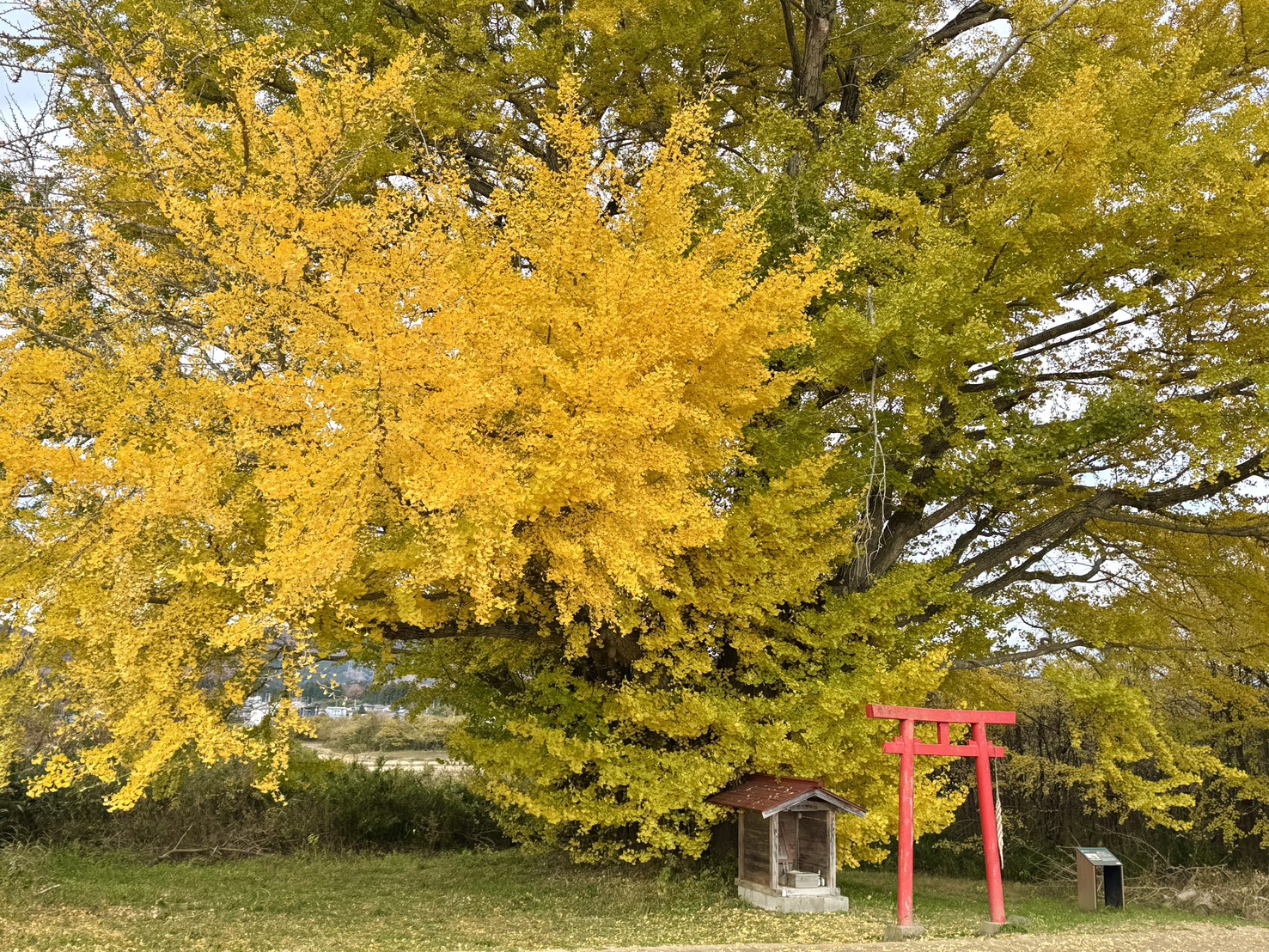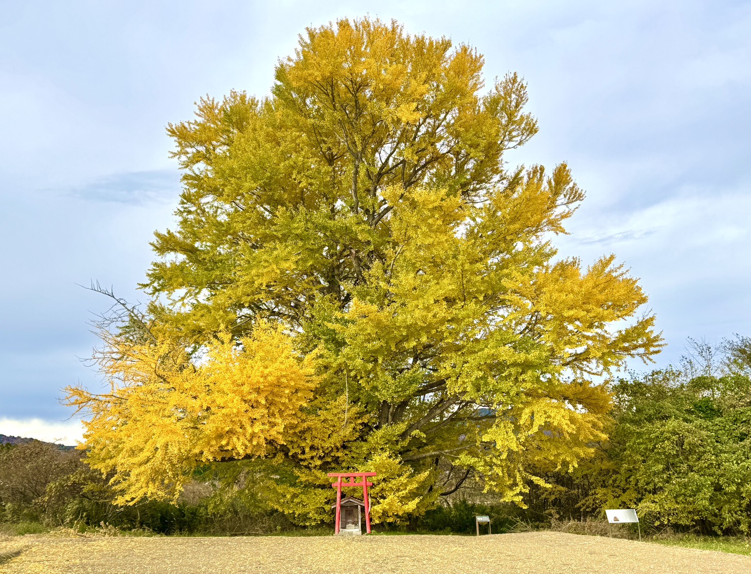 這棵銀杏樹被指定為福島縣的天然記念物,樹齡約 260 年。樹幹周長達 12.9 公尺,在福島縣巨木排行榜中名列第二。高達 25 公尺 的巨樹在秋天轉為金黃色時,景象十分震撼。藍天、金黃銀杏,以及樹根前鳥居的紅色所形成的對比美不勝收,因此也深受攝影愛好者喜愛。雖然會因天候有所變動,但每年一般在 11 月下旬至 12 月上旬 是最佳觀賞期。它位於新地町與相馬市的交界處。相傳伊達政宗攻打新地時,將手中的銀杏鞭倒插在地上,後來便生根成這棵大樹,因此又被稱為 「倒插銀杏」。