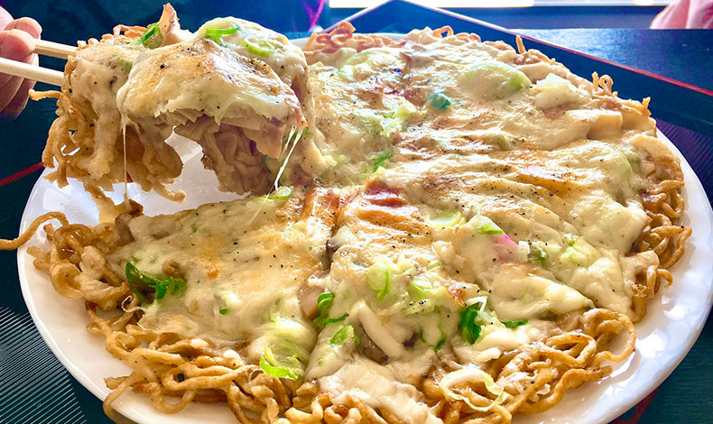 在道路休息站-喜多之鄉,除了可以吃到喜多方拉麵之外〜還可以吃到老闆用拉麵所研發的獨家創意料理-拉麵披薩,以拉麵取代餅皮,加上拉麵中所使用的常見配料〜完全沒有違和感〜美味好吃〜ps.因為是拉麵做的,吃的時候記得用筷子才是王道。