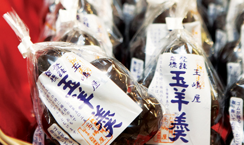 是二本松和菓子的老舖「玉嶋屋」的羊羹,是從江戶時代流傳至今,具有悠久歷史的和菓子,在昭和12年時接受到縣長的指示,為了要讓在戰地的人方便食用,便開發出玉羊羹,圓圓的球狀是它的特徵,吃法也很特別,用牙籤將外表的橡皮膜戳破後即可享用,剛好是一口大小的size很方便食用,是很好的伴手禮之一。