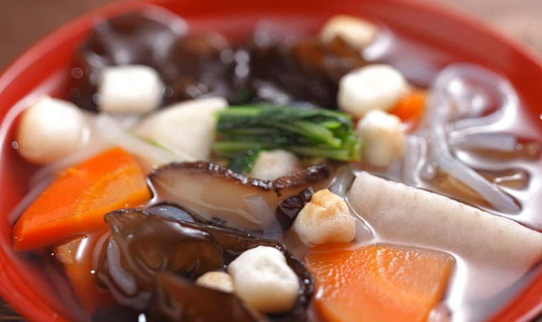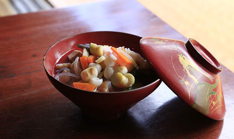 會津地區的代表性鄉土料理,各式節慶、祭典、婚喪喜慶…等重要場合中一定少不了它的存在。每個家庭都有各自相傳的作法,大致上是用干貝煮出高湯後,加入芋頭、紅蘿蔔、香菇、蒟蒻絲、麵麩等豐富食材,再用鹽及醬油調味,是一道美味的清爽湯品,在飯店的會席料理中通常都會出現唷。