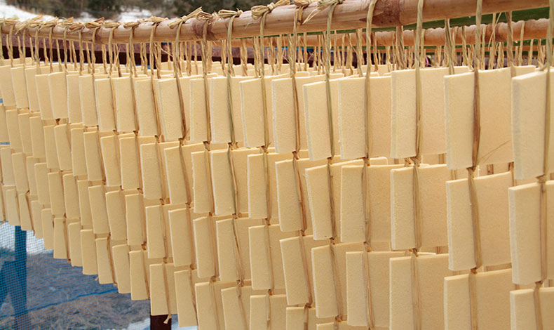 福島市立子山地區的特產,使用自家製的豆腐放在室外五天利用寒風使豆腐乾燥後即完成,12月~3月是製作凍豆腐的時期,凍豆腐營養價值高很適合拿來煮雜煮或燉菜,深受縣民喜愛。
