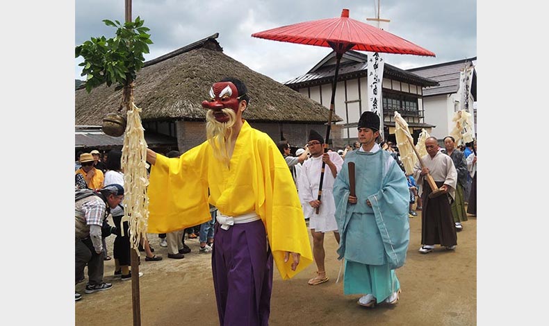 高倉神社的祭禮活動,身穿白裝束頭戴黑烏帽的當地村民,形成以神輿為中心的遊行隊伍,祈求家庭平安、五穀豐收。