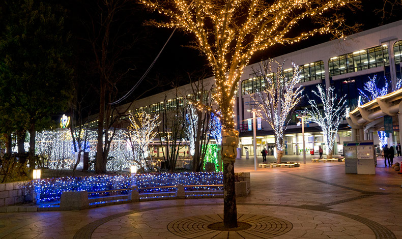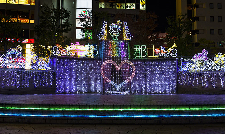 號稱音樂之都的郡山站,每年的冬季在郡山車站都會舉行點燈活動,可愛的吉祥物「樂都君」和「音符醬」的燈飾為車站增添了不少活力,璀璨的燈飾也讓夜晚的郡山車站瀰漫著神秘又浪漫的氣息。