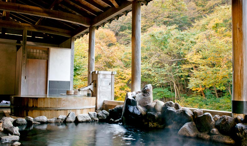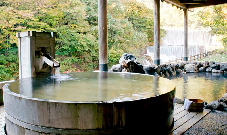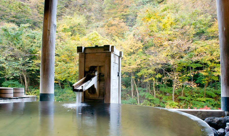 洋溢著日式氛圍的山水莊,飯店的賣點就是可以邊泡露天浴池邊欣賞壯闊瀑布,尤其是在秋季時紅葉與瀑布形成的絕景,令人讚不絕口!另外飯店的小老闆(若旦那)也是日本樂天旅遊「全國溫泉若旦那選舉」票選第一名喔!