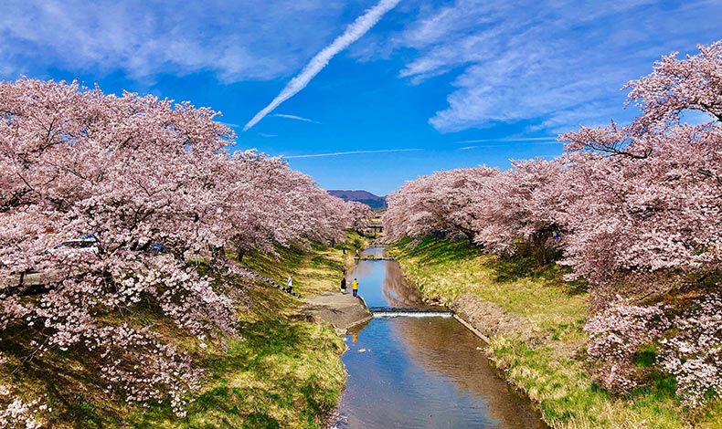 位於會津美里町的宮川千本櫻,春季時宮川河川敷公園裡的染井吉野櫻一同盛開,搭配留著殘雪的磐梯山為背景,呈現了一幅如畫般的景色,吸引許多遊客前往觀賞,這裡也是會津地區當地著名的賞櫻景點之一。