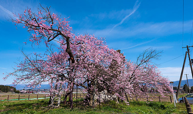 位於福島縣的會津美里町,是一棵樹齡約700年以上的紅彼岸櫻,春季如傘狀般盛開佇立在農地中,非常的有存在感。當地人時常根據米澤千歲櫻開花時期來播種,因此又別名為「種蒔櫻」