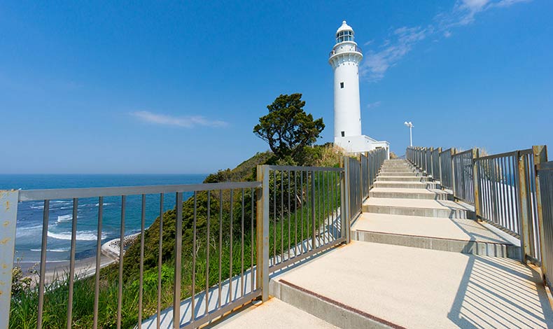 位於磐城市的塩屋埼燈台,建於明治32年(1899年),是少數可以爬到頂端膫望太平洋的燈台,這裡也是入選為「日本燈台50選」之一的人氣景點,白色燈塔與藍色海洋形成鮮豔的對比,如詩如畫般的風景,吸引許多人到訪。日本演歌女王美空雲雀的代表作「亂髮」一曲中的場景,便是這座燈塔,現在燈塔旁仍設置美空雲雀的歌碑,許多歌迷也慕名前來觀賞。