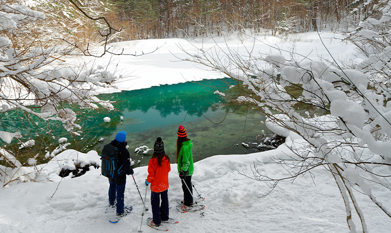 冬季穿著雪鞋在雪上健行,可以看到一片銀白色夢幻的五色沼雪景。建議參加當地的雪鞋健行行程,有嚮導帶領,裝備都可以租借,無需帶任何裝備即可參加,大人小孩都適合的五色沼雪鞋健行體驗,絕對是福島冬季必玩!