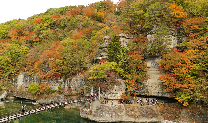 約100萬年前經過阿賀川的侵蝕與風化形成像高塔般聳立的斷崖,堪稱大自然的奇景,每年 秋季斷崖溪谷與紅葉的美景,總是吸引許多遊客到訪。