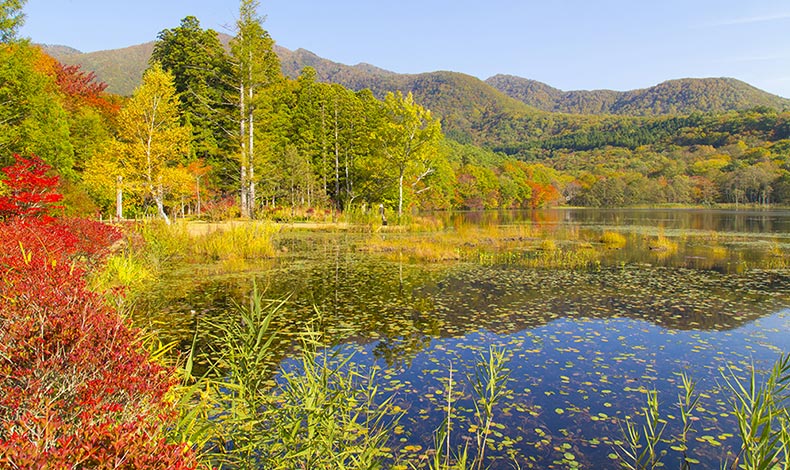 由磐梯山噴發後形成大大小小美麗的湖沼,湖沼裡包含著火山性礦物質,根據 季節、天氣、溫度、光線折射的不同,讓湖沼看起來有不同的顏色,因此稱五色沼。又有人稱它為日本版九寨溝,這裡也是福島著名的賞楓健行景點。