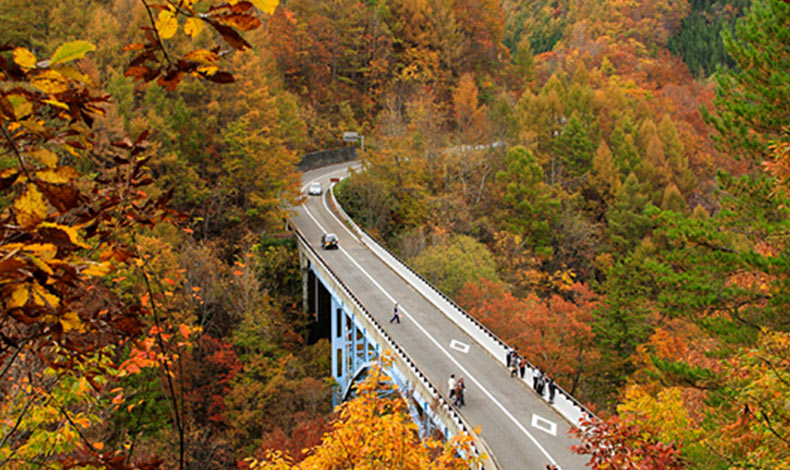 由秋元湖、小野川湖、檜原湖等湖泊與落葉松等樹林交織而成的景色,途中的中津川溪谷是絕佳的拍攝點,秋季時常會聚集很多攝影愛好者到此拍攝溪谷與楓葉的景色,而這裡有完善的遊步道,新綠或楓葉時非常推薦可以到此散策。