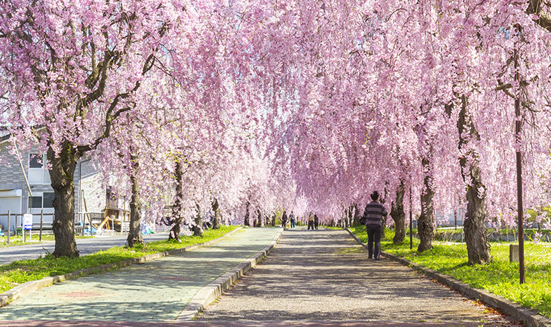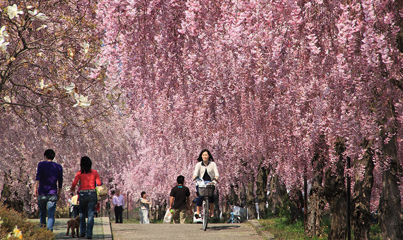 喜多方日中線記念自行車步行者道,時常榮登福島縣賞櫻排行榜第一名的景點,一到春天約3公里步道兩旁的枝垂櫻盛開,非常的美麗壯觀,途中展示過去奔馳的蒸汽火車,櫻花與火車的對比,成為最佳的拍照景點。