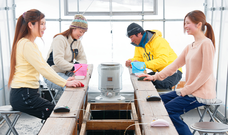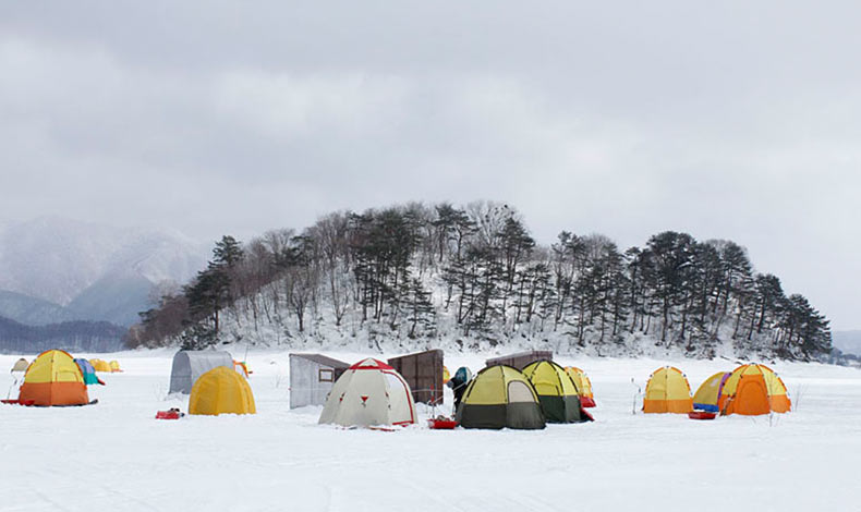 裏磐梯的檜原湖春櫻、夏綠、秋楓、冬雪不僅四季風景優美,隨著時間的變化也都可以欣賞到不同的美景,夏季時這裡更是人氣的露營與健行場所。冬季來到檜原湖,除了欣賞雪景之外,可以來體驗釣西太公魚,每年11月到3月可以看到很多釣客到訪,釣魚旺季時,在結冰的湖面上可以看到很多五彩繽紛的帳篷,這些都是垂釣西太公魚的遊客,這樣的景象也是裏磐梯冬天的風物詩。初學者可以選擇圓頂船或屋形船的體驗方案,兩手空空去即可,現場還有專業的人教你怎麼釣,釣完後有些地方可以請業者當場料理,品嚐新鮮的西太公魚,老少咸宜的冬季活動,冬季有機會來裏磐梯時記得可以來體驗一下。