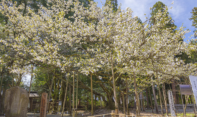 位於伊佐須美神社境內的御神木薄墨櫻,是會津五櫻之一,薄墨櫻屬於大島櫻系山櫻的一種罕見的品種,飄有獨特的香味,每年的4月29日都會舉行花祝祭,祭典中會將加入薄墨櫻做成的麻糬在供奉完神明後,會分給有付香油錢的遊客享用。