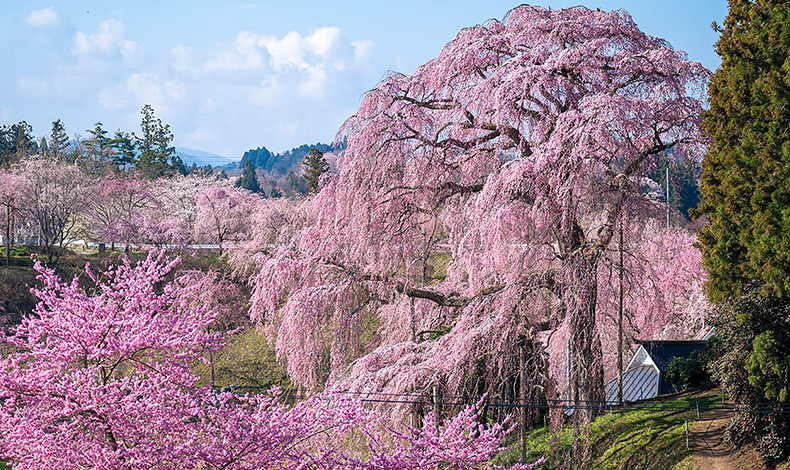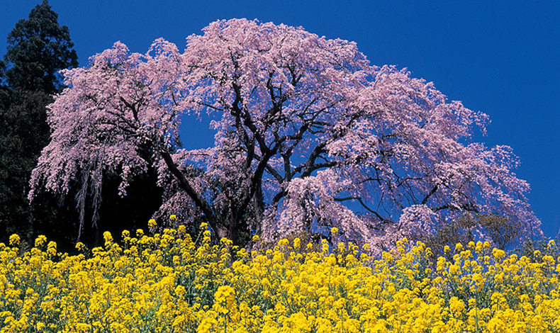 合戰場枝垂櫻,看似是一棵櫻花,其實是兩棵紅枝垂櫻花樹相依偎在一起,被稱為夫婦櫻,樹齡約180年以上,是著名的三春瀧櫻的孫櫻。每到春天櫻花盛開時,搭配前面一片黃色的油菜花畑,交織成一幅如畫般的場景,吸引不少遊客前來觀賞。