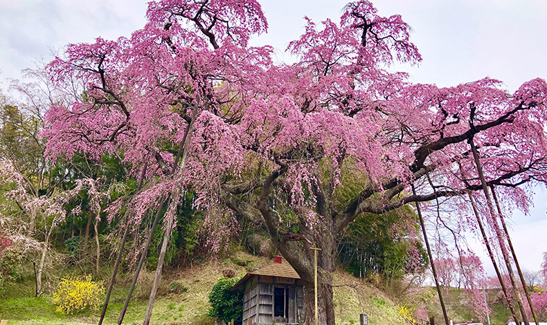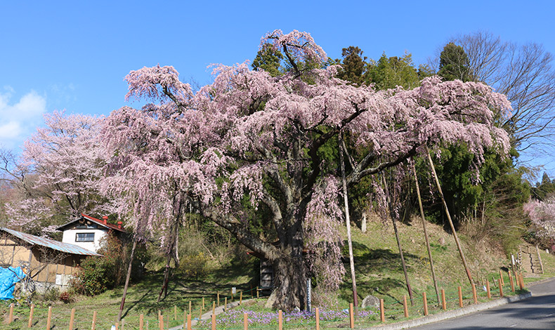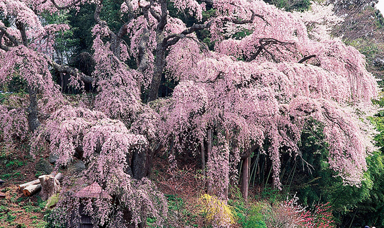 紅枝垂地藏櫻據說是三春瀧櫻的女兒,樹齡約400年,櫻花盛開時呈現妖豔的粉紅色是它的特徵,每年春天總是吸引許多遊客到此賞櫻。櫻花樹下的地藏堂自古便是為了向地藏祈求嬰兒能平安長大而設置。