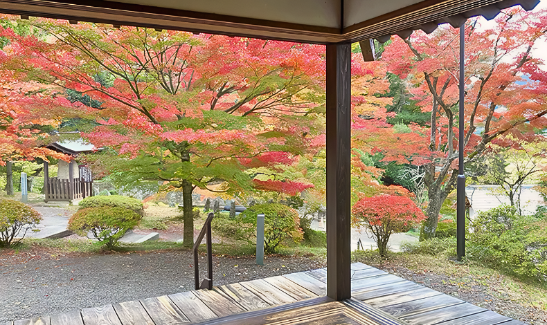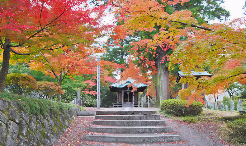 位於福島市山口的「文知摺觀音 普門院」,是俳聖松尾芭蕉也曾造訪過的歷史名勝,以「信夫文知摺」之名聞名。境內種植了許多樹木,春有櫻花、夏有紫藤與蓮花,秋天則有染成鮮紅的楓葉,讓人能一邊散步一邊沉澱心靈,是一處令人放鬆的療癒之地。日本自古流傳的建築與絢麗紅葉相映成趣,彷彿將這片空間切割出另一個時代般,充滿情調。天氣晴朗時,還能從楓葉間遠眺吾妻連峰的壯麗景色。